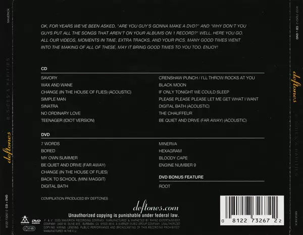 Deftones: B-Sides & Rarities versión en CD/DVD en remasterizado edición. Esta edición en concreto se lanzó en Europa en la editorial Maverick el día 13. enero 2008. Álbum abarca todos los géneros Rock, Heavy Metal y Nu Metal.