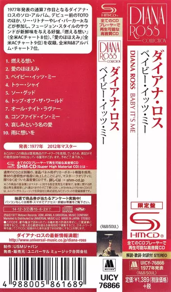 Diana Ross: Baby It's Me = ベイビー・イッツ・ミー LTD versión en CD en de edición limitada remasterizado edición. Esta edición en concreto se lanzó en Japón en la editorial Motown el día 16. diciembre 2014. Álbum abarca todos los géneros Funk / Soul, Rhythm & Blues, Soul y Disco.