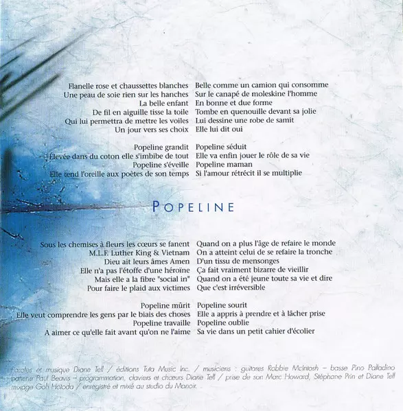 Diane Tell: Popeline versión en CD en estándar edición. Esta edición en concreto se lanzó en Francia en la editorial RCA en colaboración con BMG France y Tuta Music Inc. el día 3. noviembre 2004. Álbum abarca todos los géneros Rock, Pop, Balad, Chanson y AOR.