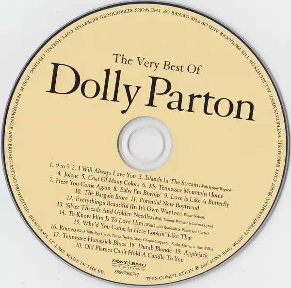 The Very Best of Dolly Parton is a compilation album released in 2007 by Dolly Parton . The album contains some of Parton's greatest hits from the past four decades, including the songs "Jolene", "I Will Always Love You" and "9 to 5". The album was commercially successful, reaching number one on the Billboard Top Country Albums chart and number ...