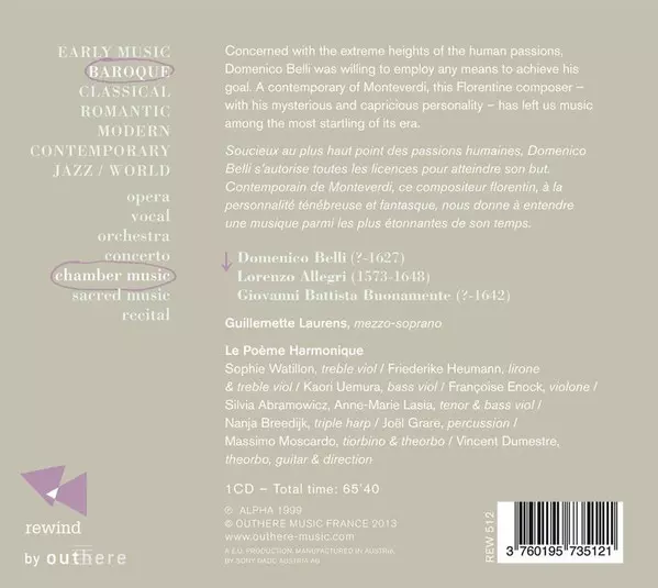 | Artista | Guillemette Laurens | Vincent Dumestre | Le Poème Harmonique | Domenico Belli |