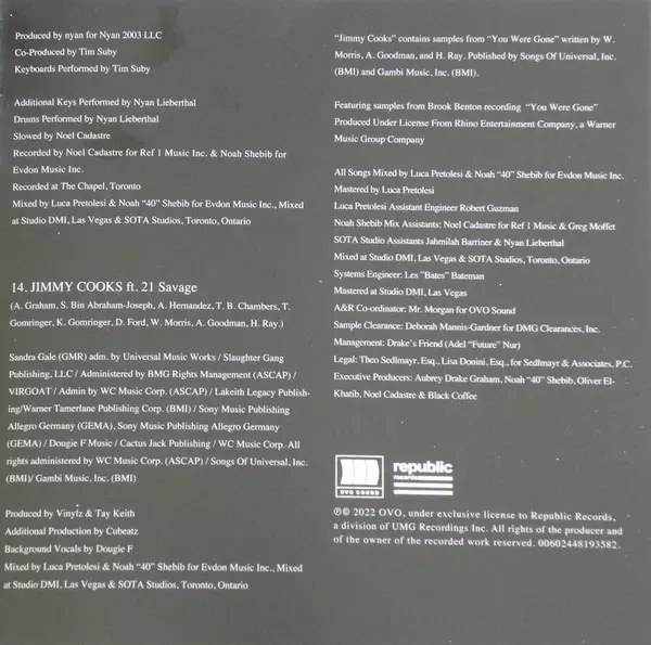 Composed By, Lyrics By Aubrey Graham, Diamante Blackmon, Marcel Kosic, Ramon Ginton | Producer Gordo (34), Ramon Ginton, Vlado (8) | Vocals [Additional] Mukengerwa Tresor Riziki