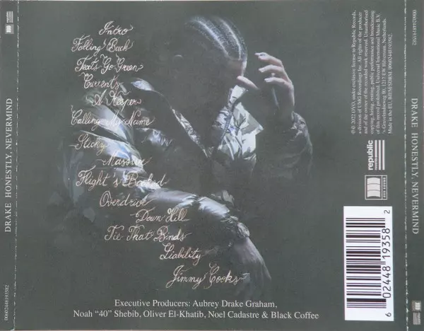 Drake: Honestly, Nevermind versión en CD en estándar edición. Esta edición en concreto se lanzó en Europa en la editorial Republic Records en colaboración con OVO (2) el día 17. marzo 2023. Álbum abarca todos los géneros Música electrónica, Hip Hop, House, Pop-Rap y Deep House.