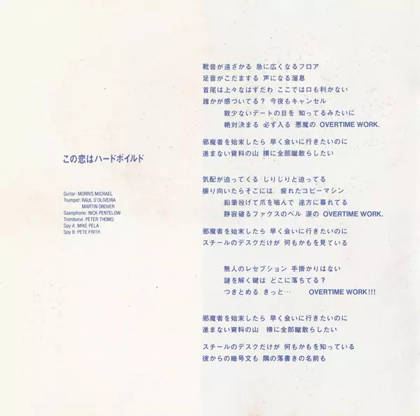 Guitar Morris Michael | Music By, Arranged By Masato Nakamura (2) | Saxophone Nick Pentelow | Trombone Peter Thoms | Trumpet Martin Drover, Raul D'Oliveira | Voice Actor [Spy A] Mike Pela | Voice Actor [Spy B] Pete Frith | Words By Miwa Yoshida