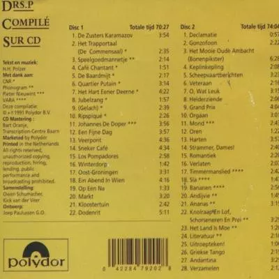 Drs. P: Compilé Sur CD versión en 2CD en estándar edición. Esta edición en concreto se lanzó en Países Bajos en la editorial Polydor el día 30. junio 1990. Álbum abarca todos los géneros Pop, Escenario y pantalla, Folk, World, & Country, Chanson, Novelty y Comedy.