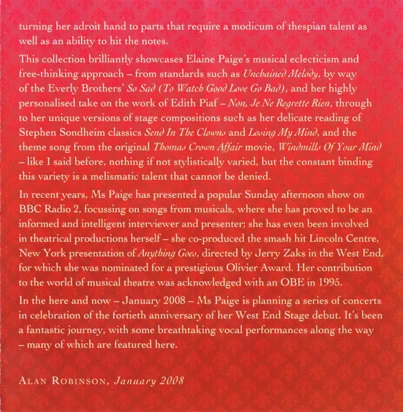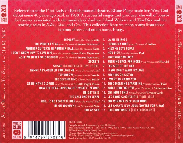 Elaine Paige: Sweet Memories (The Essential Elaine Paige) versión en 2CD en estándar edición. Esta edición en concreto se lanzó en Reino Unido en la editorial Music Club Deluxe el día 29. junio 2006. Álbum abarca todos los géneros Escenario y pantalla y Musical.