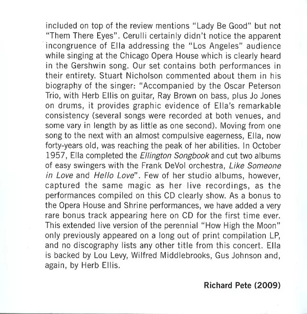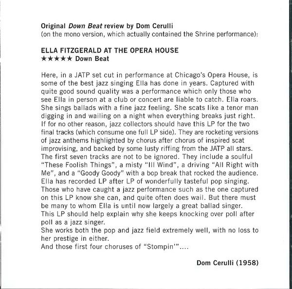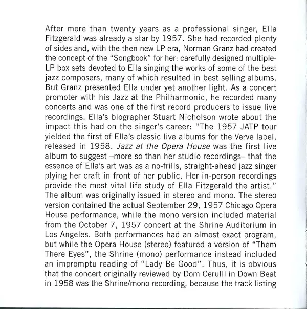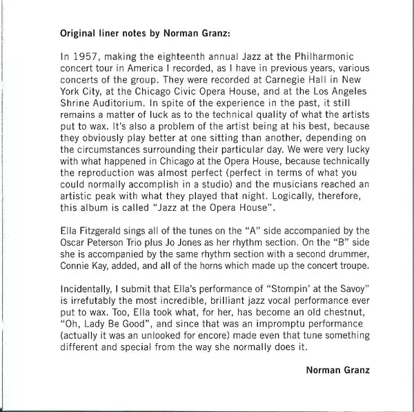 Ella Fitzgerald: Ella Fitzgerald At The Opera House versión en CD en estándar edición. Esta edición en concreto se lanzó en Europa en la editorial Poll Winners Records el día 22. diciembre 2011. Álbum abarca todos los géneros Jazz, Vocal, Swing y Bop.