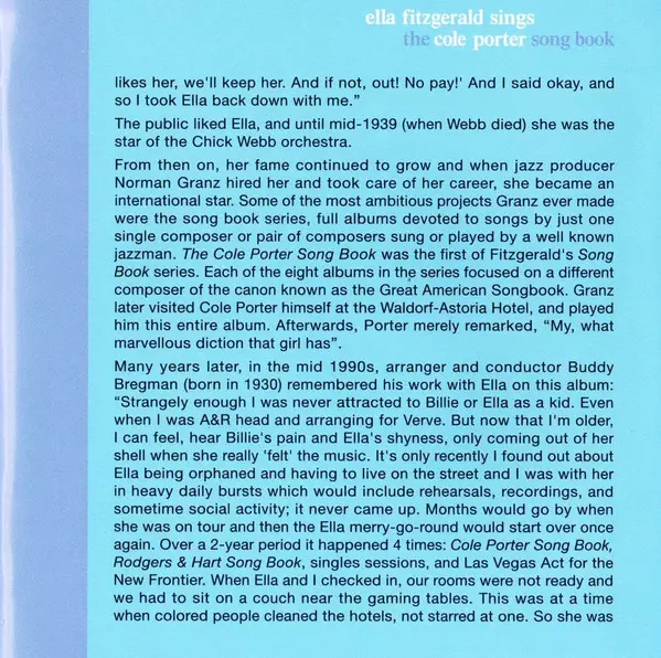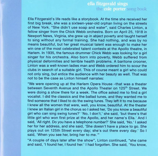 Here is the complete classic double album Ella Fitzgerald Sings The Cole Porter Song Book. The Cole Porter Song Book, the first of Ella's famous songbooks and one of the best vocal jazz albums of all time, was inducted into the Grammy Hall of Fame in 2000, which honors recordings of "qualitative or historical significance." In 2003, this recordi...