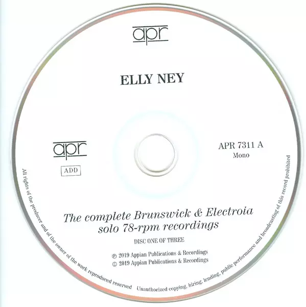 Elly Ney: The Complete Brunswick & Electrola Solo 78-rpm Recordings versión en 3CD en estándar edición. Esta edición en concreto se lanzó en Reino Unido en la editorial Appian Publications & Recordings el día 7. junio 2019. Álbum puede clasificarse como género Música clásica.
