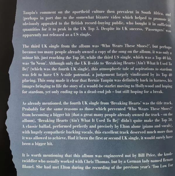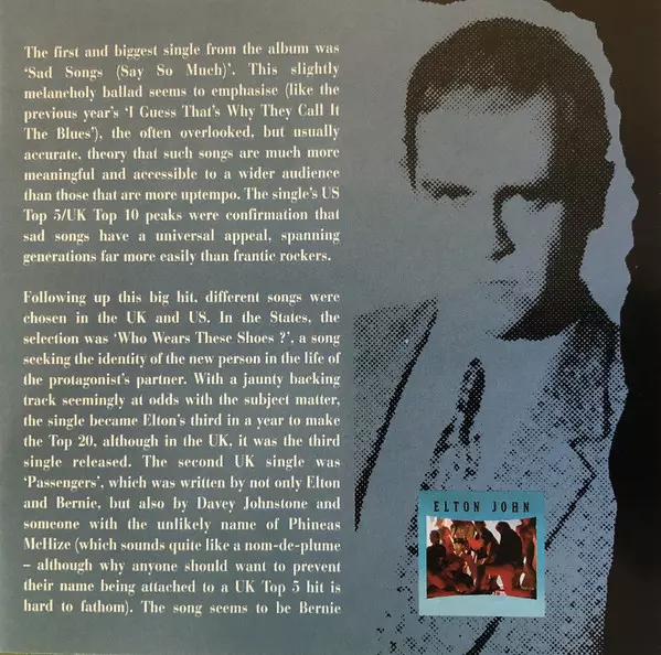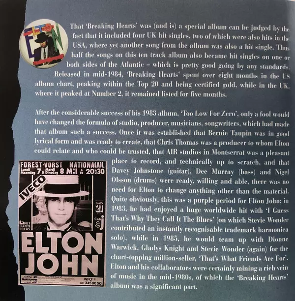 Elton John The album Breaking Hearts, released in 1984, was a commercial success. The album included the singles "Sad Songs (Say So Much)", "I'm Still Standing" and "I Guess That's Why They Call It the Blues". The album reached number one in the United States and number two in the United Kingdom.