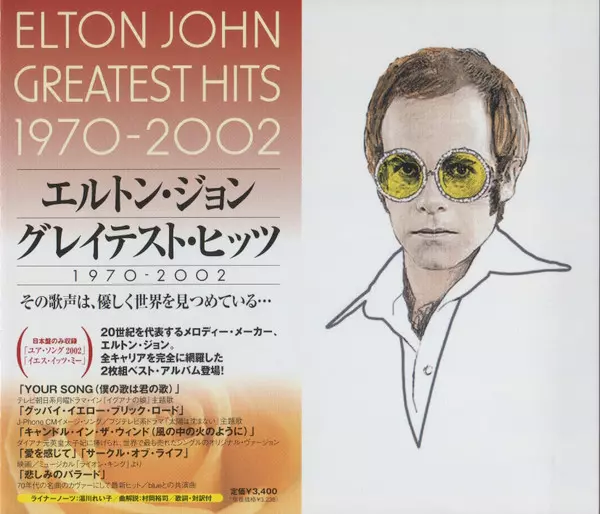 Elton John: Greatest Hits 1970-2002 = グレイテスト・ヒッツ 1970-2002 versión en 2CD en estándar edición. Esta edición en concreto se lanzó en Japón en la editorial Mercury el día 13. enero 2008. Álbum abarca todos los géneros Rock, Pop, Pop Rock y Disco.