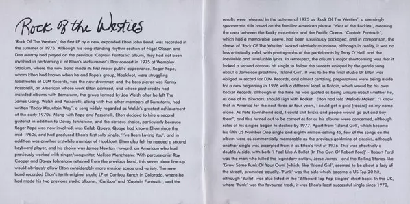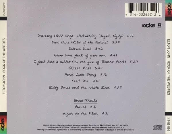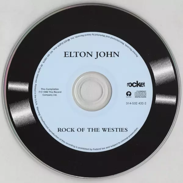 Elton John: Rock Of The Westies versión en CD en remasterizado edición. Esta edición en concreto se lanzó en EE.UU. en la editorial The Rocket Record Company en colaboración con Island Records el día 14. mayo 1996.