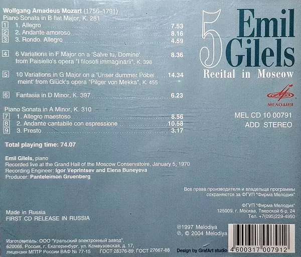 | Artista | Wolfgang Amadeus Mozart | Emil Gilels |