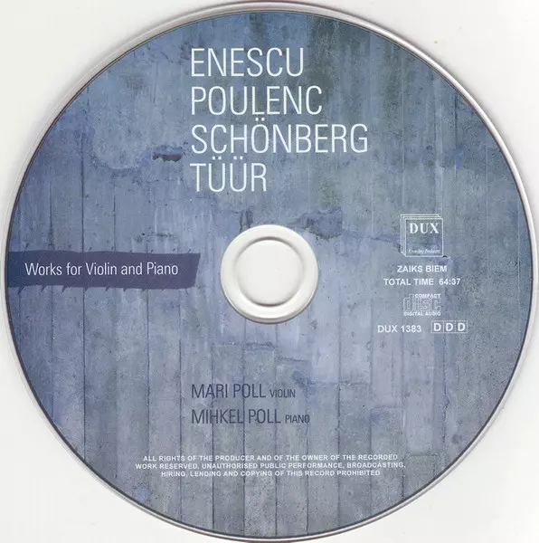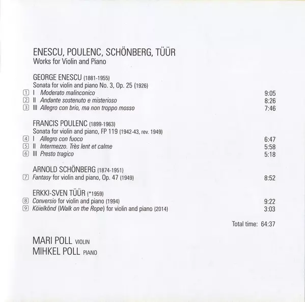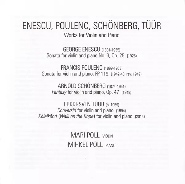 | Artista | Arnold Schoenberg | George Enescu | Francis Poulenc | Erkki-Sven Tüür | Mihkel Poll | Mari Poll |