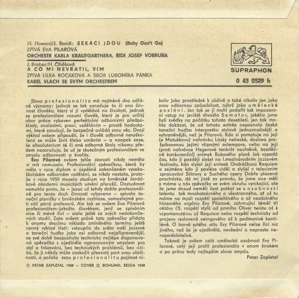 | Conductor [Řídí] Josef Vobruba | Lyrics By [Czech] Jiří Štaidl | Orchestra Orchestr Karla Krautgartnera (2) | Vocals [Zpívá] Eva Pilarová | Written-By Harlan Howard | |||