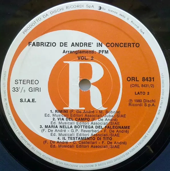 | Título | Fabrizio De André In Concerto (Arrangiamenti PFM) Vol. 2° |