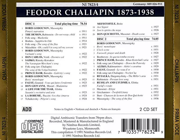 Feodor Chaliapin: Prima Voce versión en 2CD en estándar edición. Esta edición en concreto se lanzó en Reino Unido en la editorial Nimbus Records el día 1. mayo 2014. Álbum abarca todos los géneros Música clásica, Romance y Ópera.