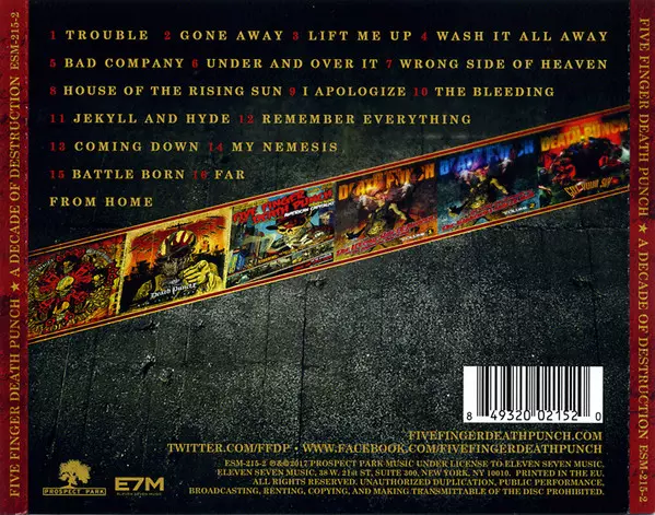 "A Decade of Destruction" features 14 of the biggest and most popular songs from Las Vegas band Five Finger Death Punch. In addition, "Trouble" and "Gone Away" are two brand new songs (the first new recordings in two years) that easily continue the band's tradition as one of the most successful and hottest modern/heavy metal bands and will delig...