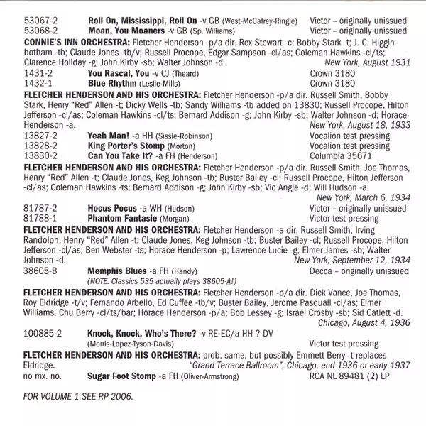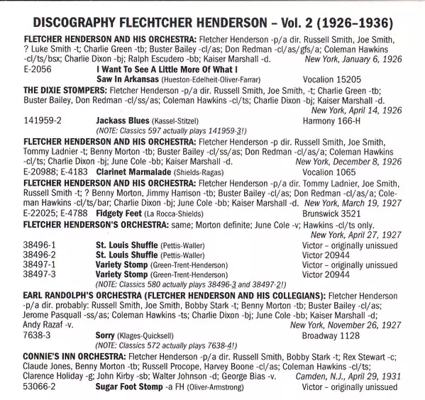 | Bass Israel Crosby | Clarinet, Alto Saxophone Buster Bailey, Jerome Pasquall | Clarinet, Tenor Saxophone, Baritone Saxophone Elmer Williams, Leon "Chu" Berry | Drums Sidney Catlett | Guitar Bob Lessey | Orchestra Fletcher Henderson And His Orchestra | Piano, Arranged By Horace Henderson | Piano, Arranged By, Leader, Directed By Fletcher Henderson | Trombone, Vocals Fernando Arbello | Trumpet, Vocals Dick Vance, Joe Thomas (4), Roy Eldridge | Written-By Bill Davies (3), Jimmy Tyson, Johnny Morris (9), Vincent Lopez (2) | |||