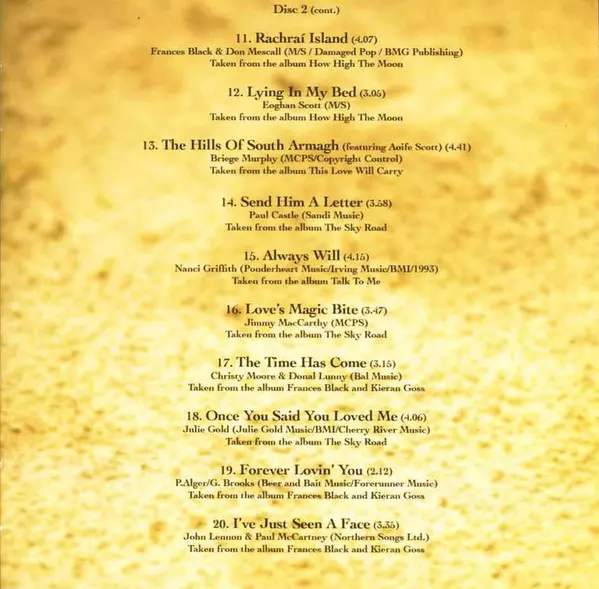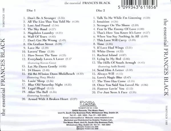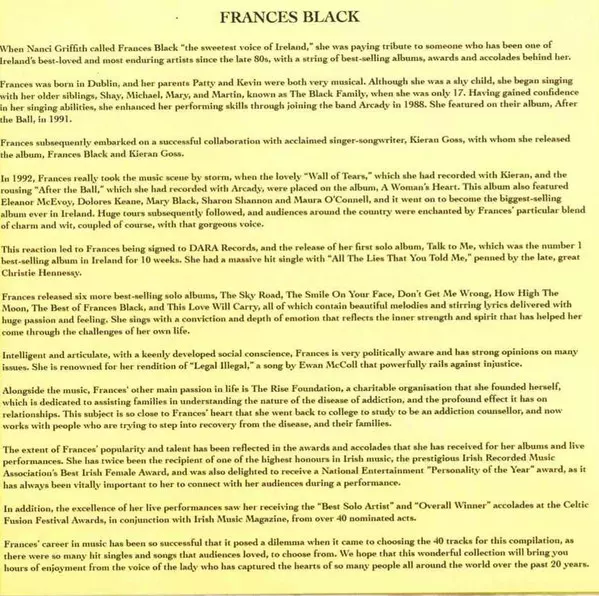 Frances Black: The Essential Frances Black versión en 2CD en estándar edición. Esta edición en concreto se lanzó en Irlanda en la editorial Dara Records el día 4. mayo 2010. Álbum puede clasificarse como género Folk, World, & Country.