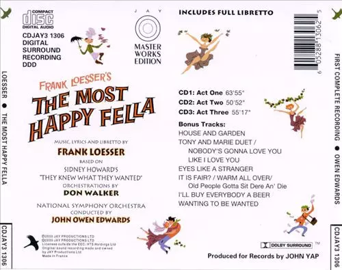 Frank Loesser: The Most Happy Fella - First Complete Recording versión en 3CD en estándar edición. Esta edición en concreto se lanzó en Francia en la editorial Jay Productions Ltd. en colaboración con Jay Masterworks Edition el día 8. agosto 2000. Álbum abarca todos los géneros Escenario y pantalla y Musical.
