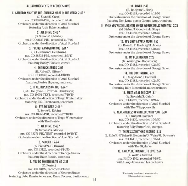 | Baritone Saxophone Ernie Caceres | Directed By [Orchestra Under The Direction Of] George Siravo | Tenor Saxophone Babe Russin | Written-By Cole Porter | |||