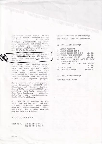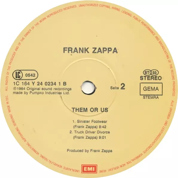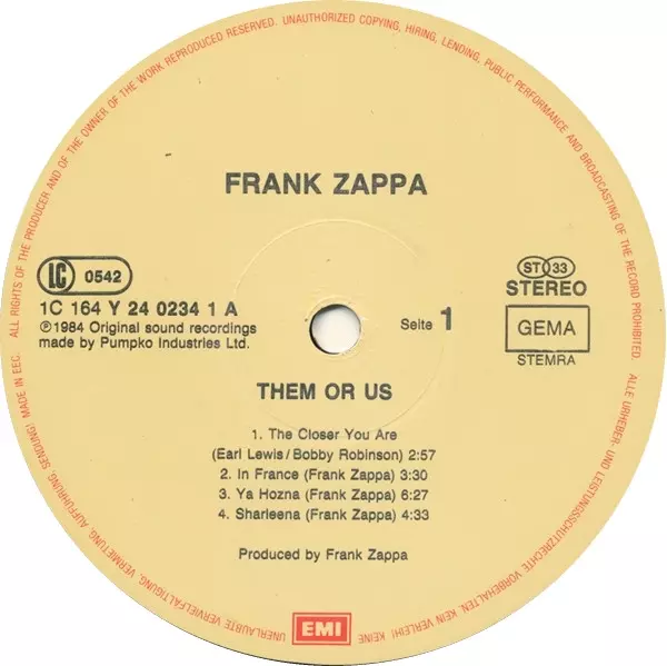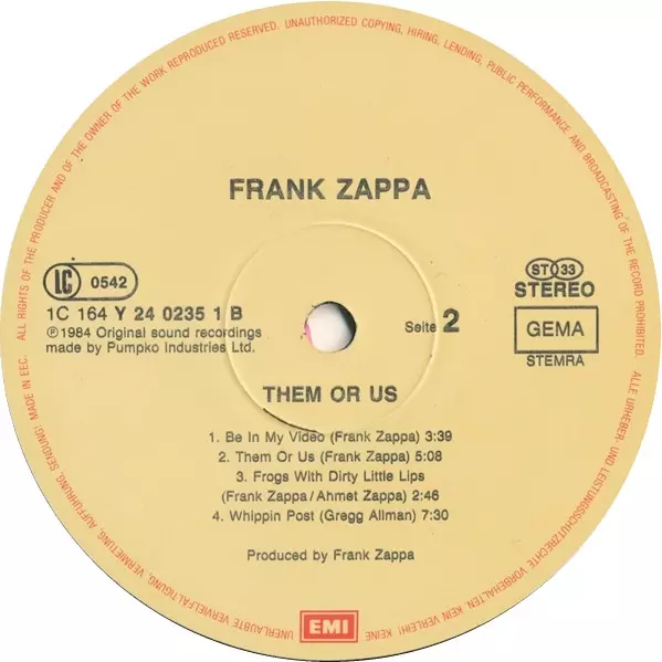 Frank Zappa: Them Or Us versión en vinilo 2LP en estándar edición. Esta edición en concreto se lanzó en Europa en la editorial EMI en colaboración con Barking Pumpkin Records el día 30. septiembre 1984. Álbum abarca todos los géneros Rock, Hard Rock, Art Rock y Avant-garde. Gatefold Vinyl.