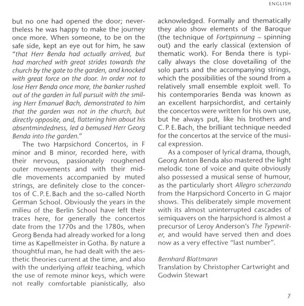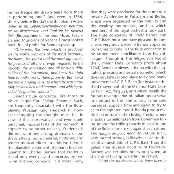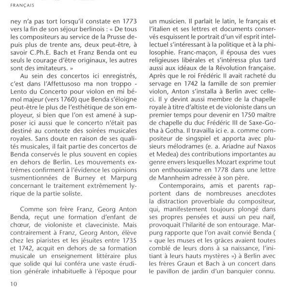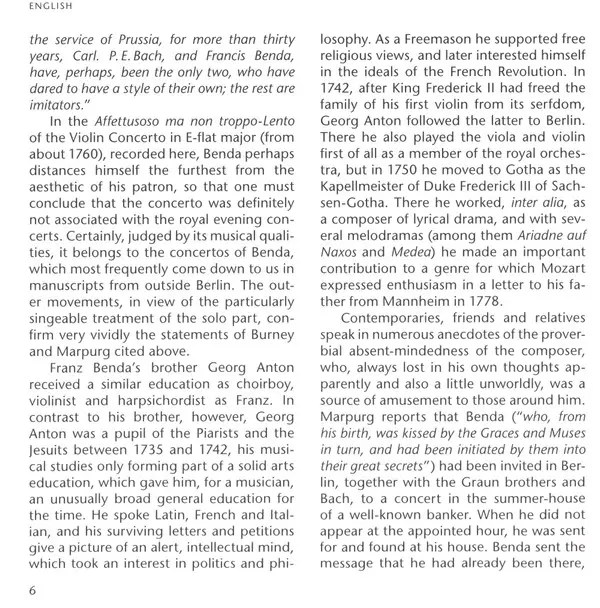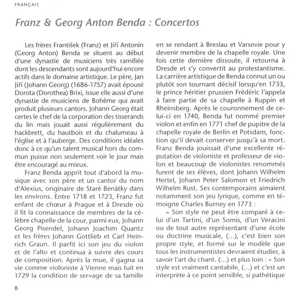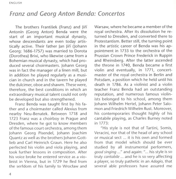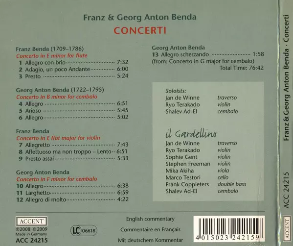 | Artista | Georg Anton Benda | František Benda | Shalev Ad-El | Il Gardellino | Jan De Winne | Ryo Terakado |