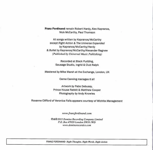 Franz Ferdinand: Right Thoughts, Right Words, Right Action versión en CD en estándar edición. Esta edición en concreto se lanzó en Europa en la editorial Domino el día 27. agosto 2013.