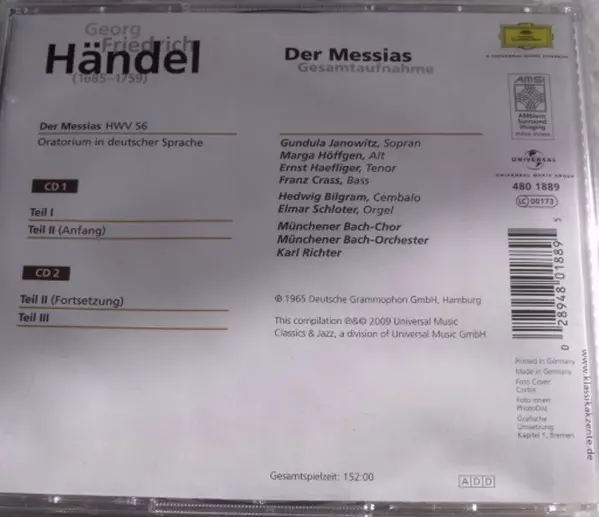 Ernst Haefliger: Der Messias (Gesamtaufnahme) versión en 2CD en remasterizado edición. Esta edición en concreto se lanzó en Alemania en la editorial Deutsche Grammophon en colaboración con Universal Music Group el día 20. febrero 2009. Álbum abarca todos los géneros Música clásica, Música barroca y Oratorio. In Dt.sprache.