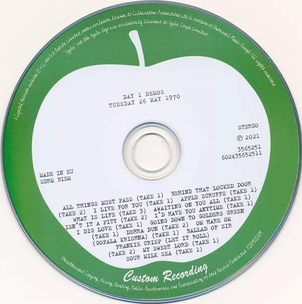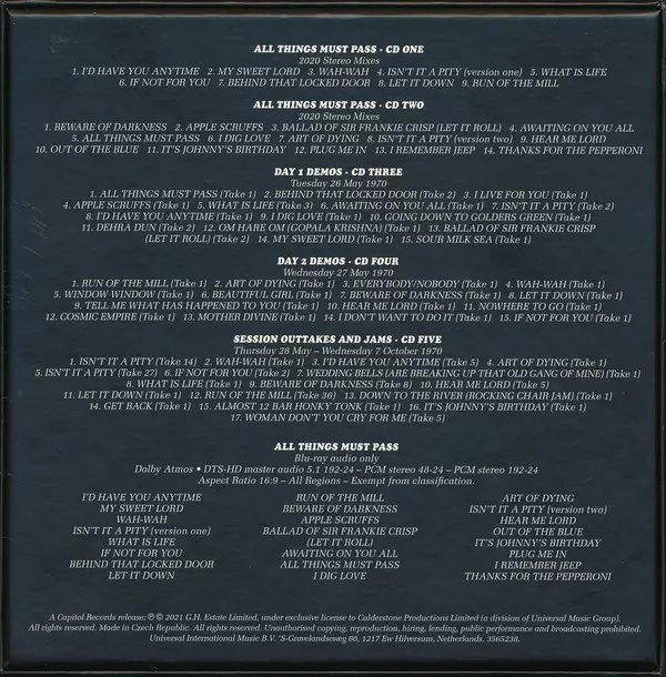 George Harrison: All Things Must Pass (50th Anniversary) DLX versión en 5CD/Caja/Blu-ray en deluxe edición. Esta edición en concreto se lanzó en la editorial Capitol Records en colaboración con Apple Records, Dark Horse Records y UMe el día 6. agosto 2021.