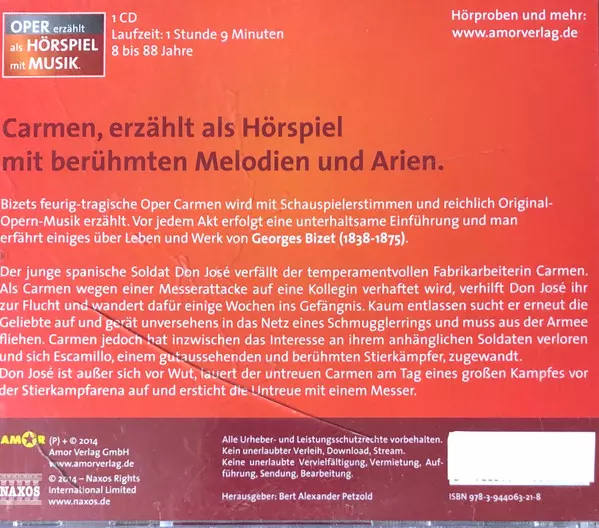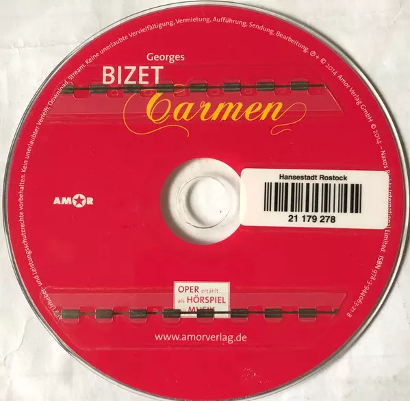 Georges Bizet: Carmen versión en CD en estándar edición. Esta edición en concreto se lanzó en Alemania en la editorial Amor (7) en colaboración con Naxos el día 10. marzo 2014. Álbum abarca todos los géneros Música clásica, Non-Music, Para niños y Ópera.