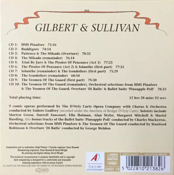 Gilbert & Sullivan: Operas Of Gilbert And Sullivan versión en 10CD/Caja en estándar edición. Esta edición en concreto se lanzó en Reino Unido en la editorial Avid Entertainment el día 20. abril 2004. Álbum abarca todos los géneros Música clásica, Escenario y pantalla y Operetta.
