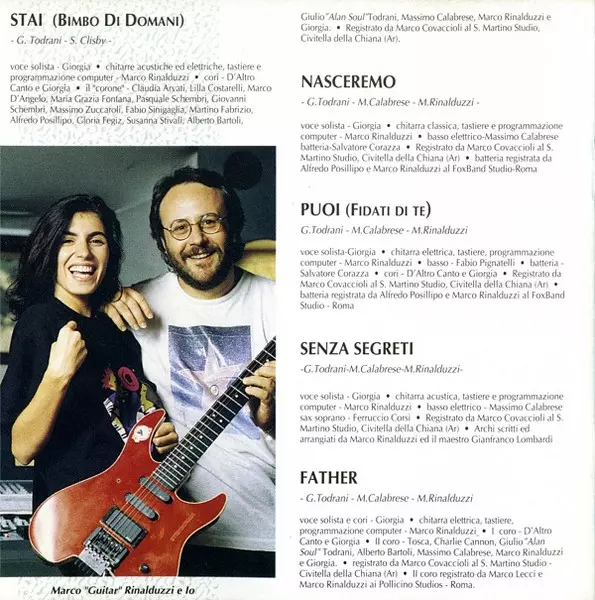 Acoustic Guitar, Electric Guitar, Keyboards, Programmed By Marco Rinalduzzi | Backing Vocals D'Altro Canto, Giorgia | Backing Vocals [Il "Corone"] Alberto Bartoli, Alfredo Posillipo, Claudia Arvati, Fabio Sinigaglia, Giorgia, Giovanni Schembri, Giulio Todrani, Gloria Fegiz, Lilla Costarelli, Marco D'Angelo, Marco Rinalduzzi, Maria Grazia Fontana, Martino Fabrizio, Massimo Calabrese, Massimo Zuccaroli, Pasquale Schembri, Susanna Stivali | Lead Vocals Giorgia | Recorded By Mark Covaccioli | Written-By Giorgia Todrani, Steve Clisby