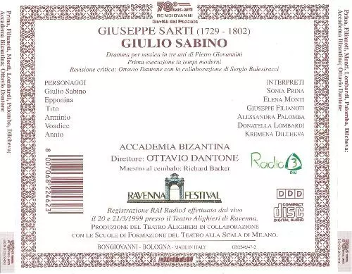 | Artista | Ottavio Dantone | Accademia Bizantina | Sonia Prina | Giuseppe Sarti | Giuseppe Filianoti | Elena Monti | Alessandra Palomba | Donatella Lombardi | Kremena Dilcheva |