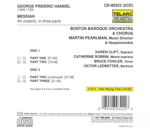 Georg Friedrich Händel: Messiah versión en 2CD en estándar edición. Esta edición en concreto se lanzó en EE.UU. en la editorial Telarc el día 24. noviembre 1992. Álbum abarca todos los géneros Música clásica, Música barroca y Oratorio.