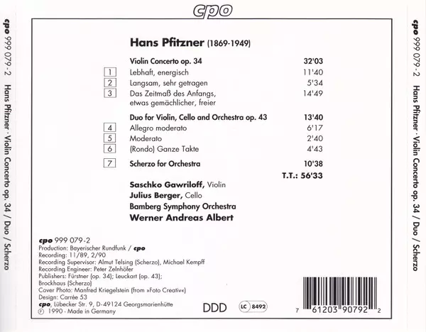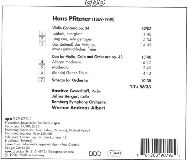 | Artista | Bamberger Symphoniker | Hans Pfitzner | Werner Andreas Albert | Julius Berger | Saschko Gawriloff |