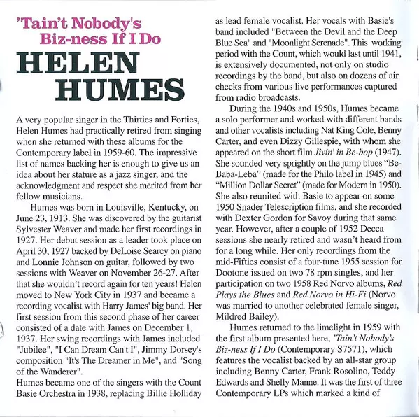 Helen Humes: 'Tain't Nobody's Biz-ness If I Do + Songs I Like To Sing! versión en CD en estándar edición. Esta edición en concreto se lanzó en Europa en la editorial Essential Jazz Classics el día 21. febrero 2012. Álbum abarca todos los géneros Jazz, Vocal y CoolJazz.