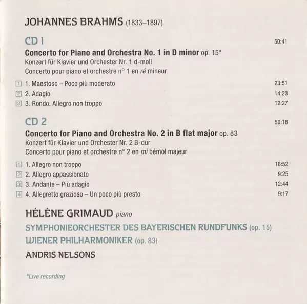 | Artista | Wiener Philharmoniker | Johannes Brahms | Symphonie-Orchester Des Bayerischen Rundfunks | Hélène Grimaud | Andris Nelsons |