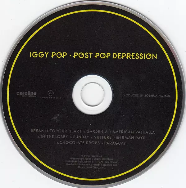 Iggy Pop: Post Pop Depression versión en CD en estándar edición. Esta edición en concreto se lanzó en Europa en la editorial Caroline International en colaboración con Rekords Rekords el día 18. marzo 2016.
