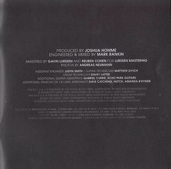 Bass, Acoustic Guitar [Nylon Acoustic], Piano, Other [Funmachine], Vocals [Gang Vox] Josh Homme | Cello Richard Dodd (2) | Drums, Vocals [Gang Vox] Matt Helders | Twelve-String Guitar [12 String Electric], Vocals [Gang Vox] Dean Fertita | Viola Lauren Chipman | Violin Daphne Chen, Eric Gorfain | Vocals [Vox] Iggy Pop