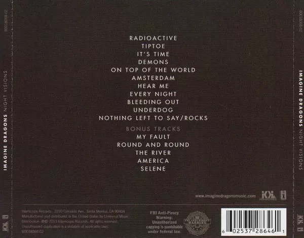 Imagine Dragons: Night Visions DLX versión en CD en deluxe edición. Esta edición en concreto se lanzó en EE.UU. en la editorial KIDinaKORNER en colaboración con Interscope Records el día 12. febrero 2013.