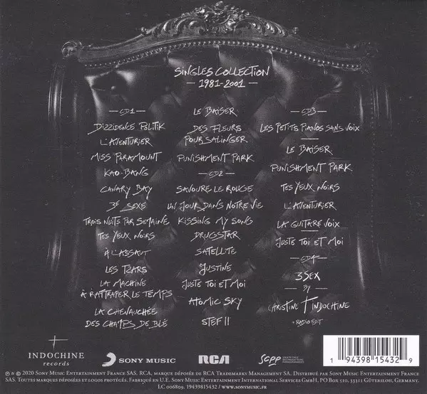 Indochine: Singles Collection 1981 - 2001 DLX versión en 4CD/Caja en deluxe edición. Esta edición en concreto se lanzó en Francia en la editorial Indochine Records en colaboración con RCA y Sony Music el día 18. diciembre 2020. Álbum abarca todos los géneros Rock, Pop y Pop Rock. Collector 1981 2001 Deluxe Edition.