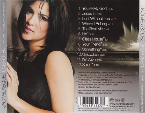 Jaci Velasquez: Unspoken versión en CD en estándar edición. Esta edición en concreto se lanzó en EE.UU. en la editorial Curb Records en colaboración con Word y Warner Bros. Records el día 25. marzo 2003. Álbum abarca todos los géneros Rock, Pop, Pop Rock, Soft Rock y Religious.