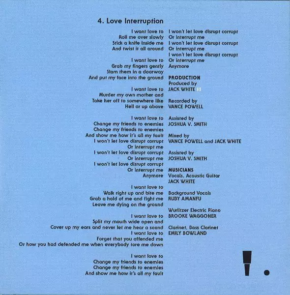 Bass Jack Lawrence | Drums, Tambourine Daru Jones | Electric Guitar Jake Orrall | Mixed By Jack White (2), Vance Powell | Producer Jack White (2) | Recorded By Vance Powell | Recorded By [Assisted By], Mixed By [Assisted By] Joshua V. Smith | Vocals, Piano Jack White (2)