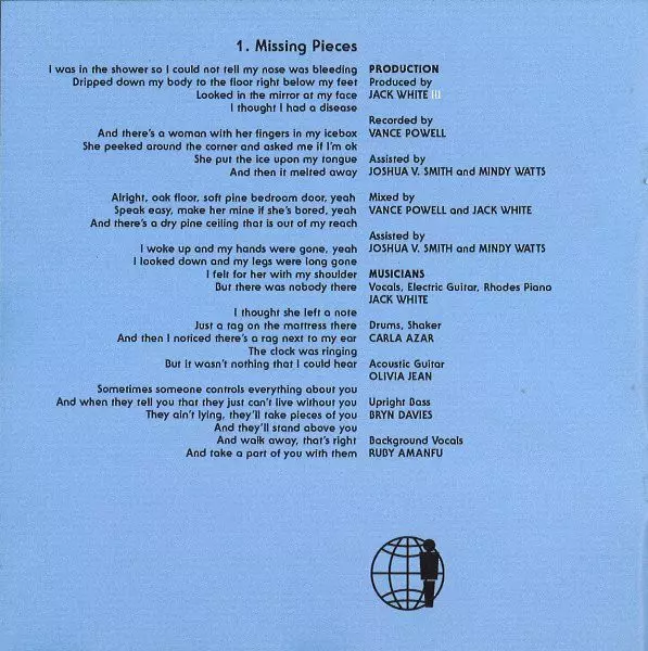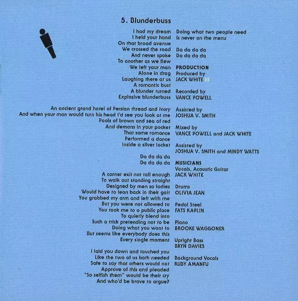 Double Bass [Upright Bass] Bryn Davies | Drums Carla Azar | Mandolin Fats Kaplin | Mixed By Jack White (2), Vance Powell | Mixed By [Assisted By] Joshua V. Smith, Mindy Watts | Piano Brooke Waggoner | Producer Jack White (2) | Recorded By Vance Powell | Recorded By [Assisted By] Joshua V. Smith | Vocals, Acoustic Guitar Jack White (2)