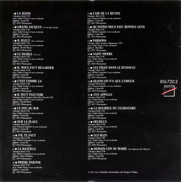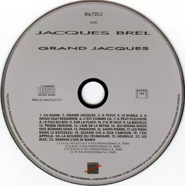 Jacques Brel: Grand Jacques versión en CD en estándar edición. Esta edición en concreto se lanzó en Francia en la editorial Barclay el día 30. enero 1989. Álbum abarca todos los géneros Pop y Chanson.