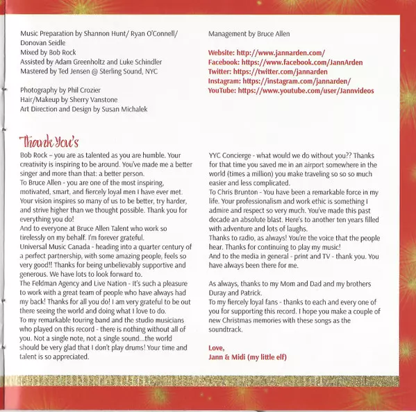 Jann Arden: A Jann Arden Christmas versión en CD en estándar edición. Esta edición en concreto se lanzó en Canadá en la editorial Universal Music Canada el día 6. noviembre 2015. Álbum abarca todos los géneros Pop, Jazz y Holiday.