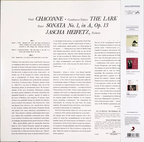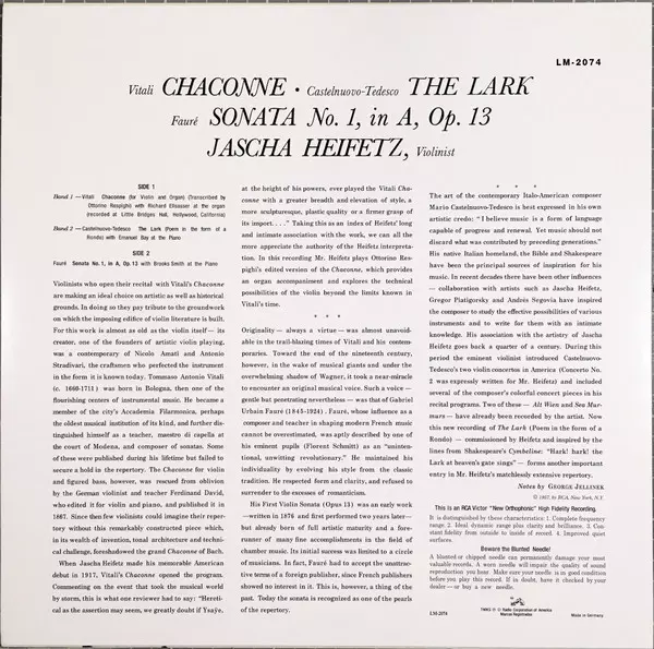| Artista | Gabriel Fauré | Jascha Heifetz | Mario Castelnuovo Tedesco | Tomaso Antonio Vitali | Emanuel Bay | Brooks Smith |