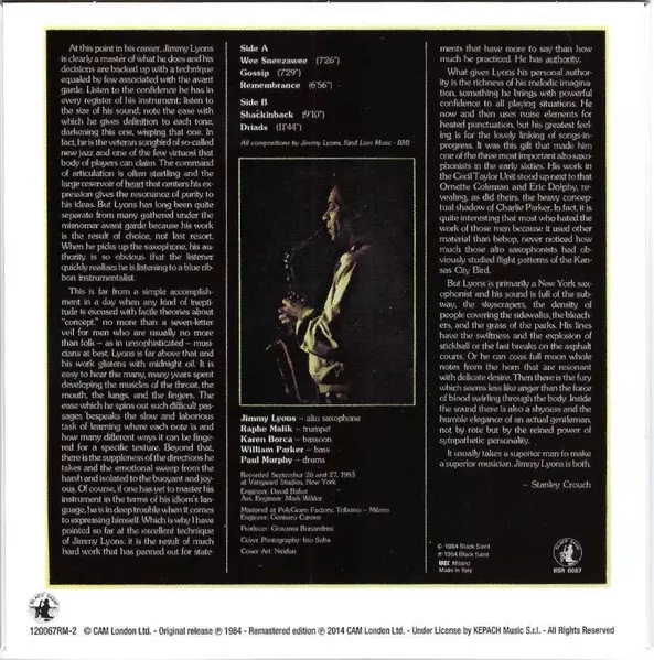 | Alto Saxophone Jimmy Lyons (2) | Bass Jay Oliver (3) | Bassoon Karen Borca | Composed By Jimmy Lyons (2) | Drums Paul Murphy (3) | Ensemble Jimmy Lyons Quintet | Trumpet, Flugelhorn Enrico Rava | ||